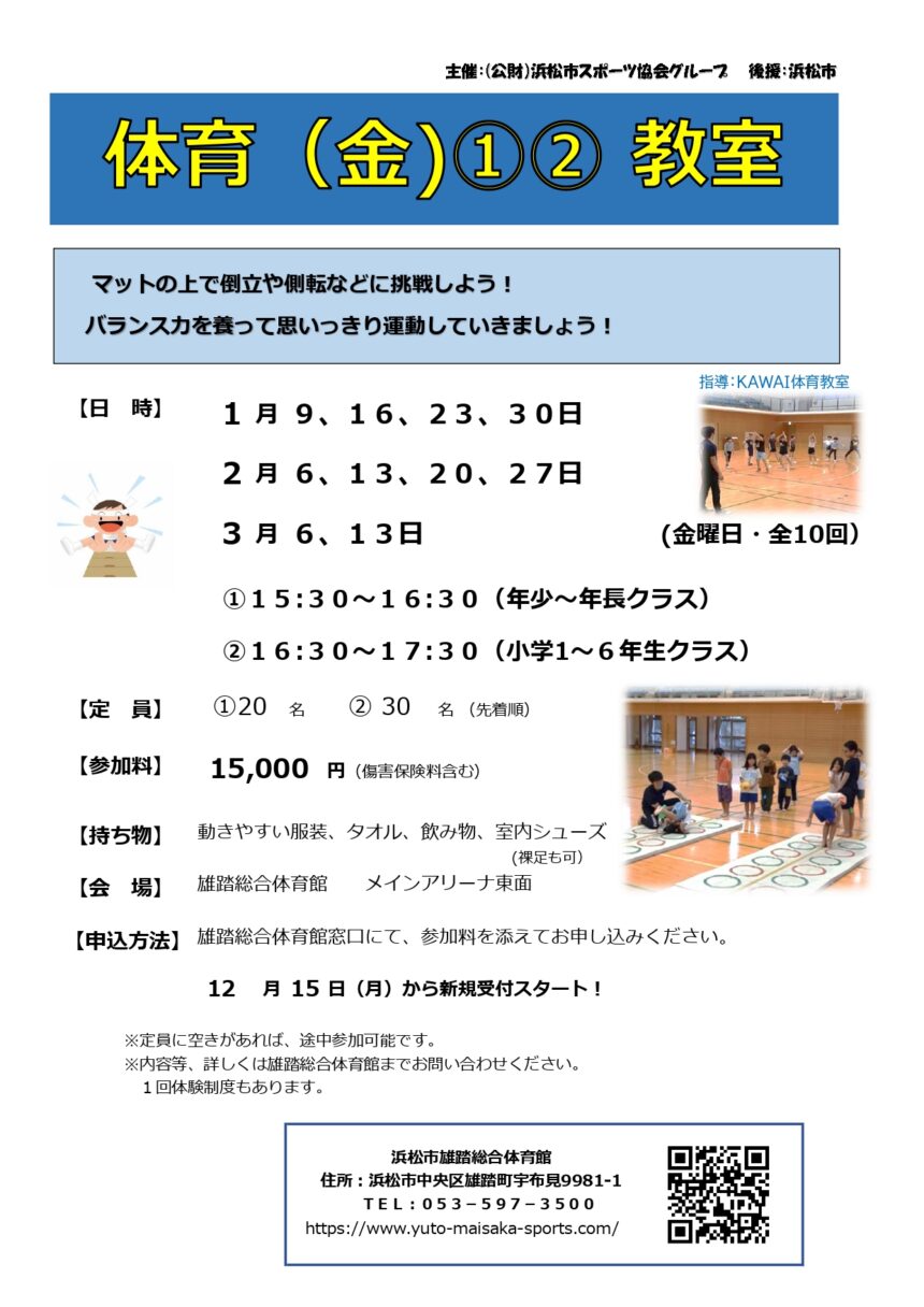 跳び箱やマット、鉄棒など…。 色々な種目を経験して、体を動かすことの楽しさを学び、運動の好きな子になろう! ①が年少~年長児 ②が小学1~6年生を対象としたクラスとなります。