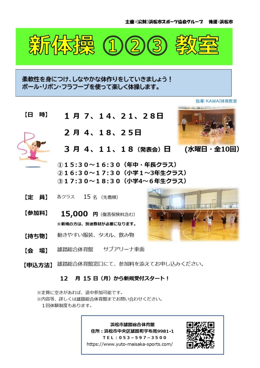 音楽に合わせて美しく身体表現をするスポーツである新体操。 柔軟性やリズム感が自然に身に付きますよ! ①が年中~年長児 ②が小学1~3年生③が小学4~6年生を対象としたクラスとなります。